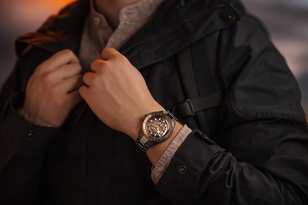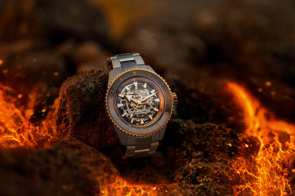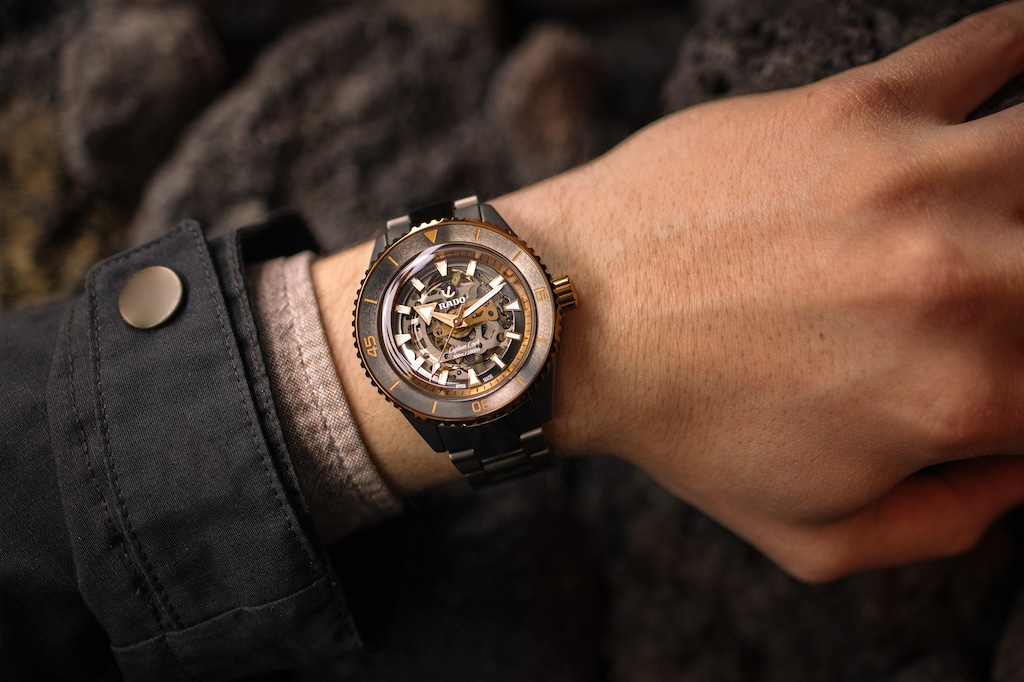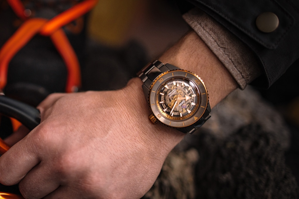 Captain Cook庫克船長高科技陶瓷鏤空腕錶搭載創新型R808機芯,對比鮮明的設計、頂尖製錶技藝,以及巧妙的幾何形狀令人嘆為觀止。愛錶人士可以清楚鑑賞各個零件的運轉。腕錶搭載高度可靠的防磁NivachronTM游絲,且在五個方位進行了全面測試,並提供長達80小時的動力儲存。做工精湛的啞光飾面整體式構造錶殼由環形拉絲等離子高科技陶瓷錶圈襯片構成,與錶殼和外部錶鏈的色調相輝映。在可旋轉錶圈內,溫暖明亮的玫瑰金色時標與盒形雙面防反光藍寶石水晶錶鏡形成鮮明對比。錶盤採簡約的設計風格,指針覆有白色Super-LumiNova®夜光塗層,以提高光線不足時的可讀性。