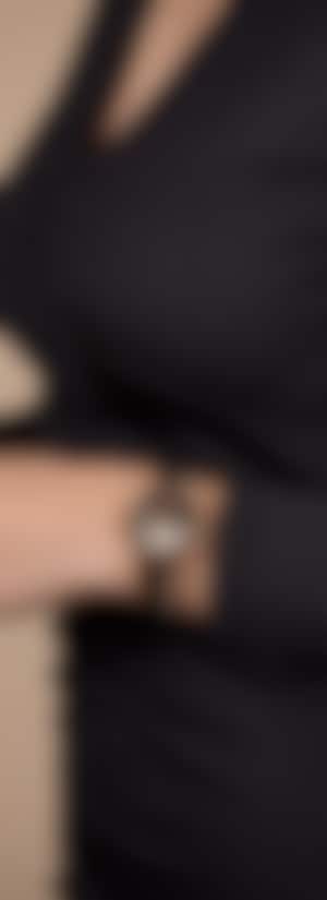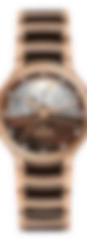 Experience the harmonious blend of artistic expression and design stylings with the Rado Centrix Open Heart watch. As the constellations write their eternal stories above our heads, they build bridges for lovers to meet. A large window, reminiscent at once of dawn and dusk, beautifully frames a state-of-the-art R734 automatic movement with 80 hours of power reserve and an antimagnetic NivachronTM hairspring, as well as a deeply elegant rippled-sunlight "ondulé soleil" motif on chosen component surfaces. The overall appearance of this iconic timepiece is completed with adjusted case lugs and a bracelet made of polished rose-gold-coloured PVD-coated stainless steel with brown high-tech ceramic middle links. The dark brown mother-of-pearl dial with 12 diamonds, emphasised with the rose gold coloured printed “jubilé” logo, matches perfectly with the hands. The watch is water resistant down to 50 m and is also available in L size.